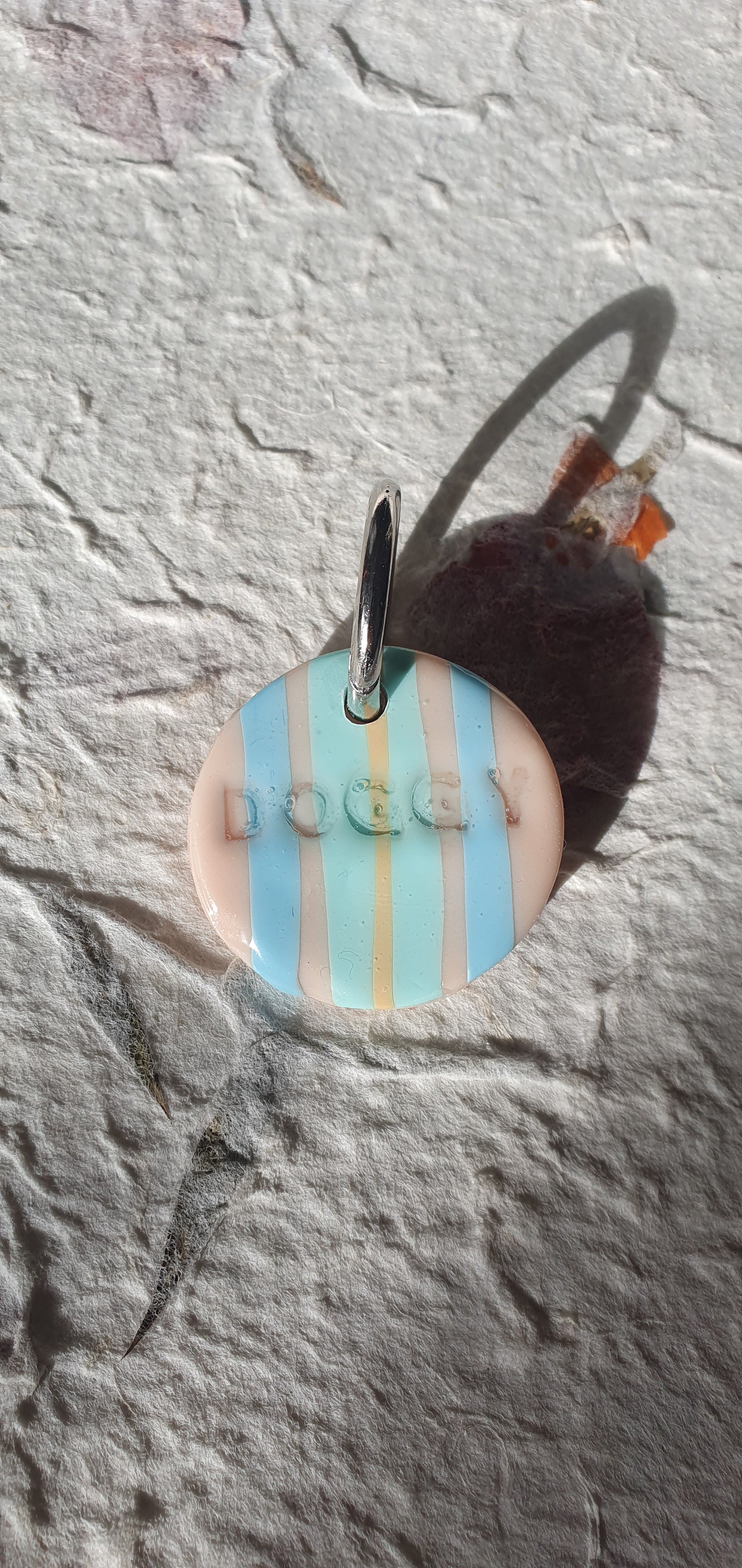 Médaille d'identification artisanale pour votre chien en pâte polymère avec rayures Biarritz et finition résine UV. Chaque médaille est une pièce unique, entièrement façonnée à la main.