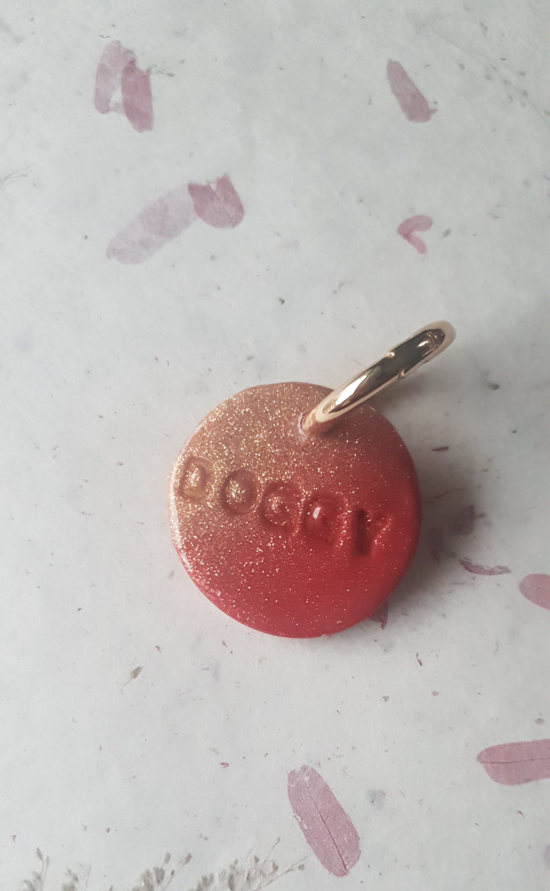 Médaille d'identification artisanale pour votre chien en pâte polymère avec paillettes et finition résine UV. Chaque médaille est une pièce unique, entièrement façonnée à la main.