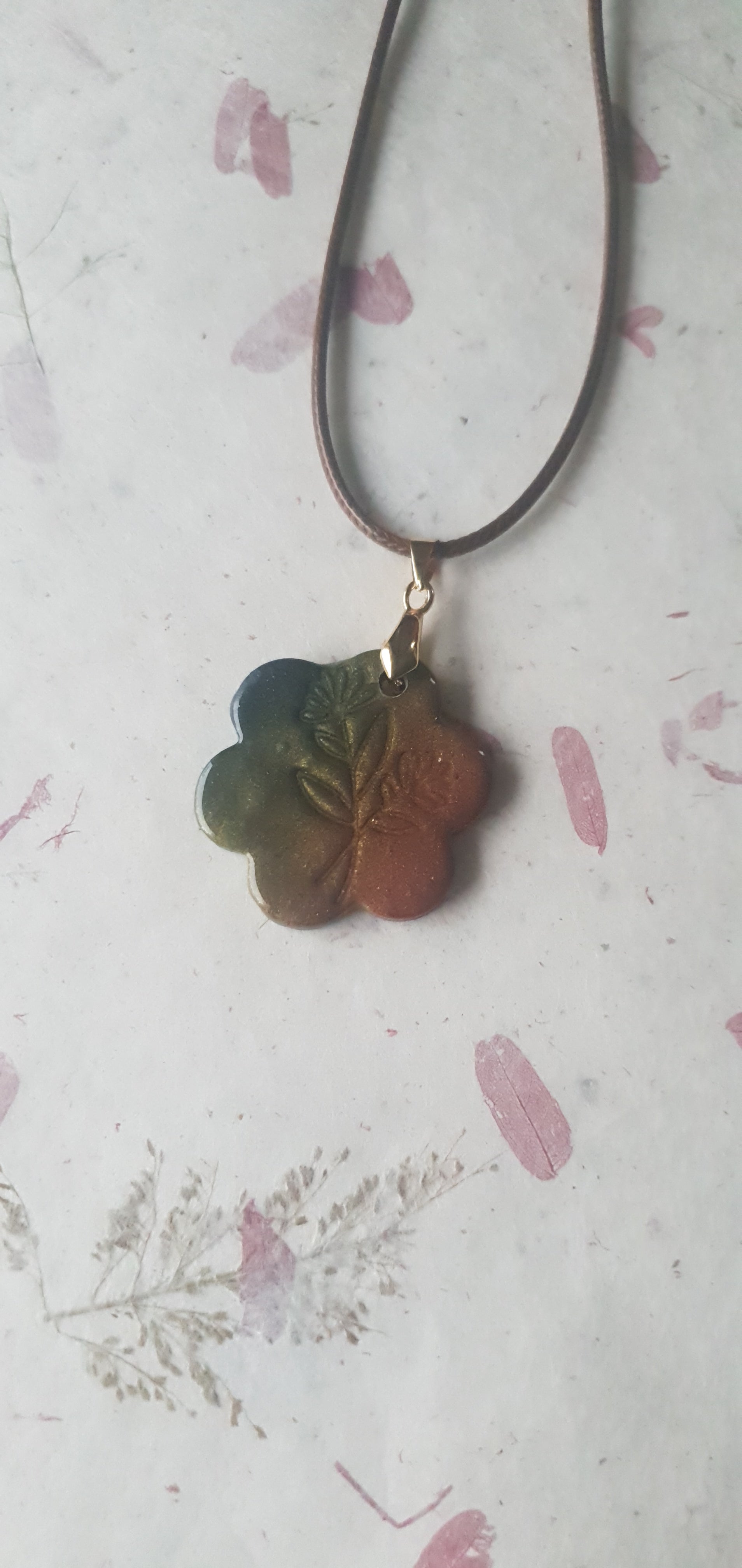 Pendentif artisanal en pâte polymère avec paillettes et finition résine UV. Pièce unique façonnée à la main.
